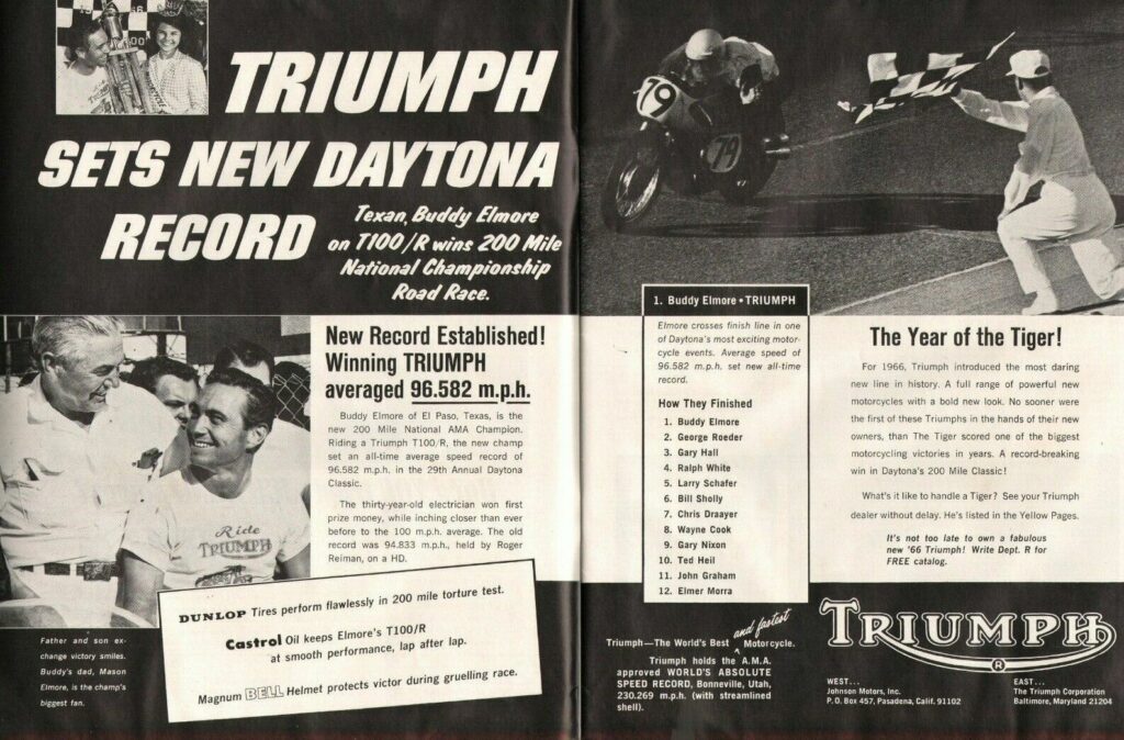 In March 1966, American racer Buddy Elmore defied the odds to claim victory at the legendary Daytona 200-mile race, riding a ‘works special’ 500cc Triumph Tiger 100.
