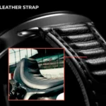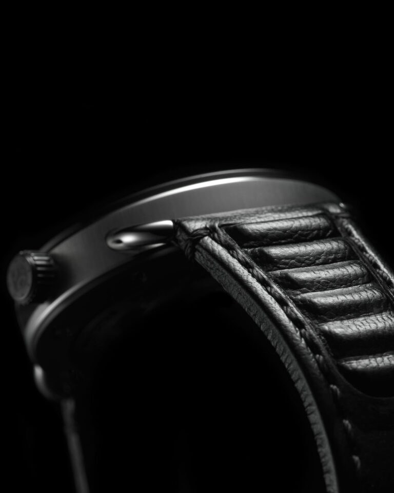 - Black double calf leather strap with ribbed inlay, white loop, stamped black inner lining and curved springbar
