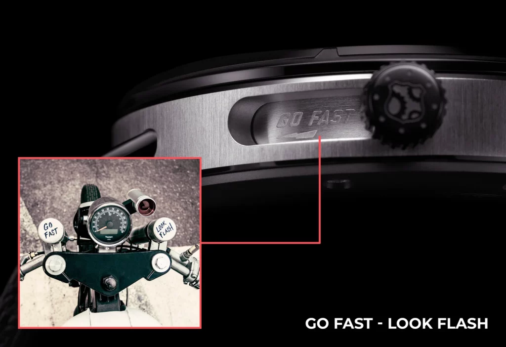 The ICON 1000 team’s philosophy, “Go Fast, Look Flash,” powered both their bold 2013 Triumph Speedmaster and our own pursuit of horological edge.