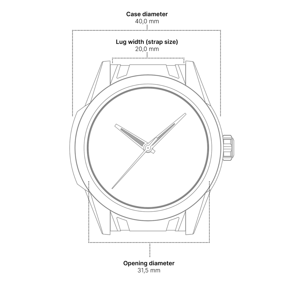 - Case, bezel, crown & caseback: 316L Stainless steel.