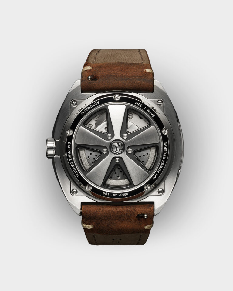 At the heart of every 901 is a dial made from an original Porsche 911. No repainting. No sanding. Just raw, reclaimed metal – imperfections intact.