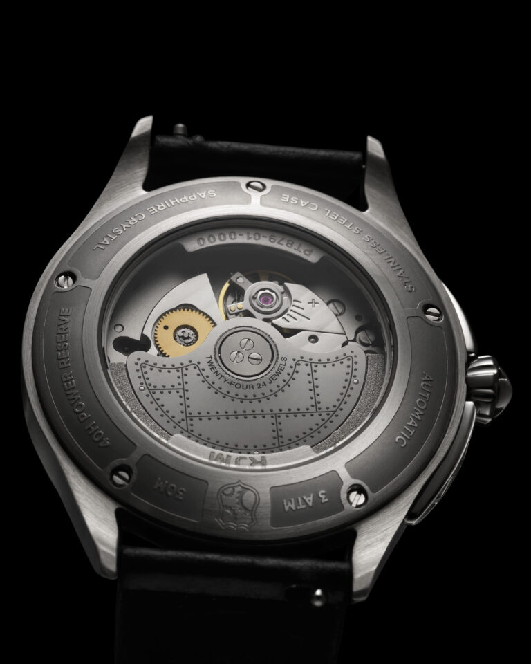 The handcrafted and untreated aluminium dial is cut directly from the wings of the PT879 MK IX Spitfire aircraft.