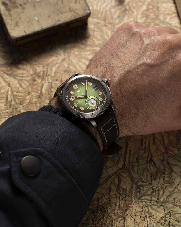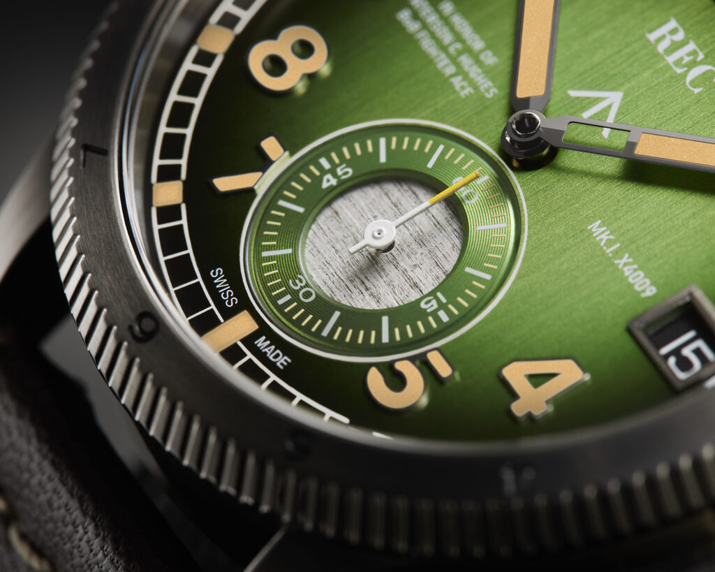 Fumé sunburst dial with repurposed Mk1A Spitfire X4009 fueselage aluminium integrated at 6 o’clock