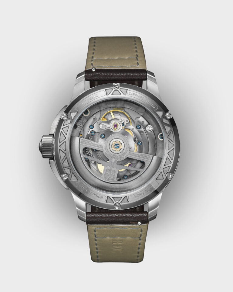 The X4009 Series borrows from both Spitfire design and pilot heritage. The case echoes wing profiles. The crown evokes a nose cone. At 6 o’clock: real fuselage metal, scarred by time and battle.
