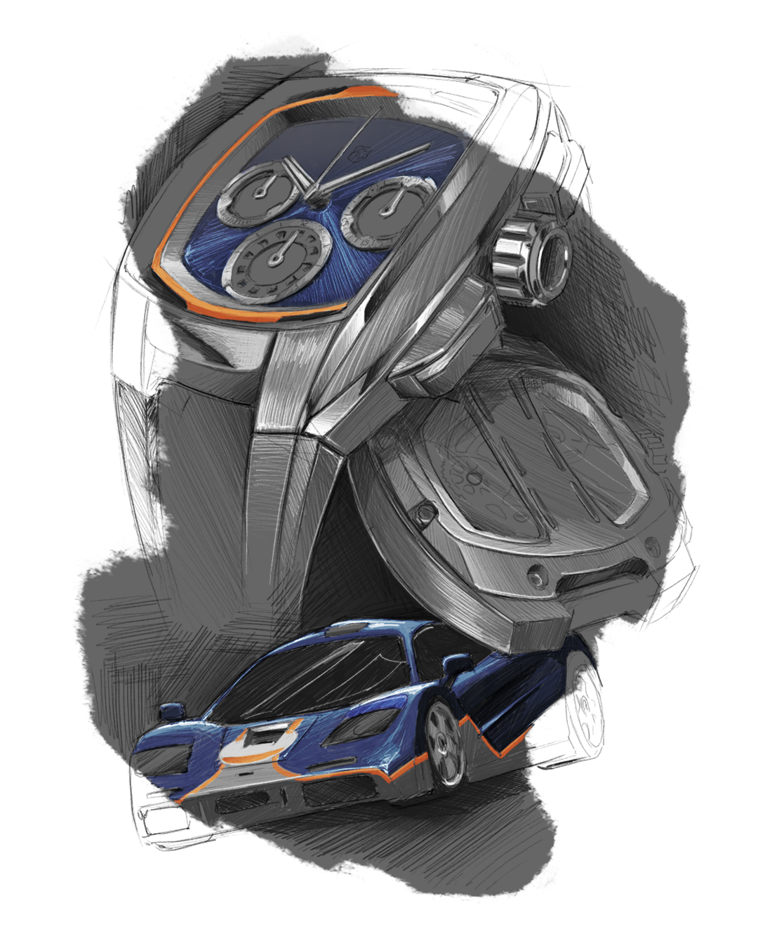 This timepiece currently in development is a DNA Limited Edition, made from the legendary McLaren F1 – and not just any McLaren F1, but the GTR chassis no. 02R, the six-time race-winning endurance car that competed in a unique deep-blue Gulf livery and the equally legendary Ueno Clinic livery.