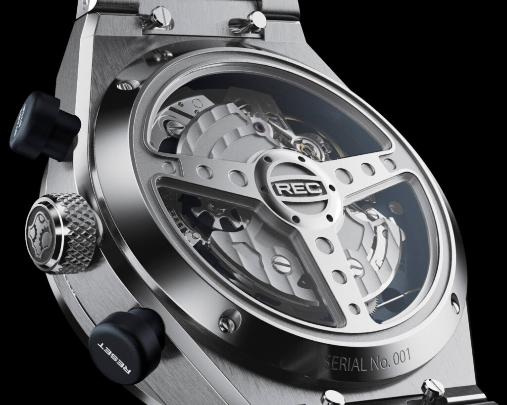 The 40mm vintage-inspired watch houses the Swiss REC – 5100M manual-winding flyback chronograph, with a 63-hour power reserve and decorated bridges visible through its exhibition caseback.