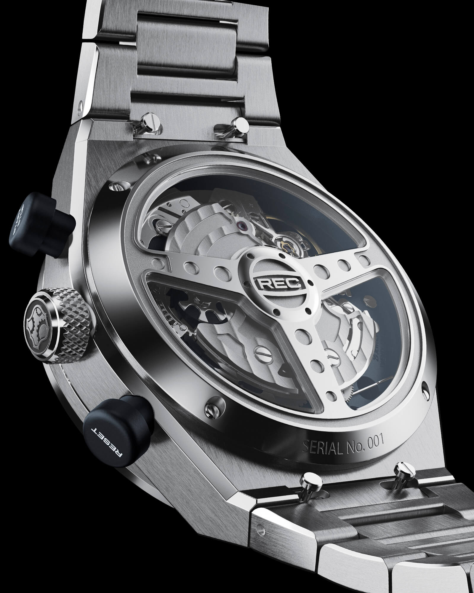 The 40mm vintage-inspired watch houses the Swiss REC – 5100M manual-winding flyback chronograph, with a 63-hour power reserve and decorated bridges visible through its exhibition caseback.