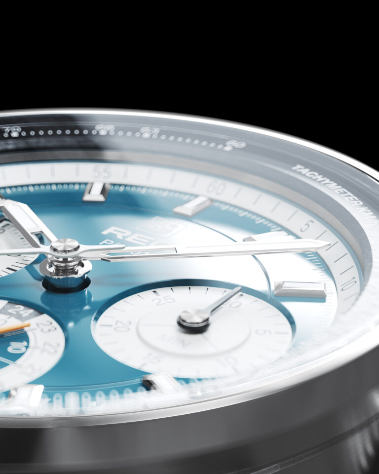 The 40mm vintage-inspired watch houses the Swiss REC – 5100M manual-winding flyback chronograph, with a 63-hour power reserve and decorated bridges visible through its exhibition caseback.