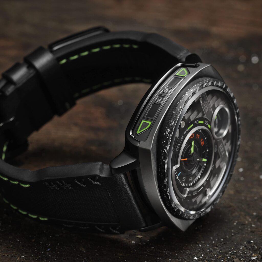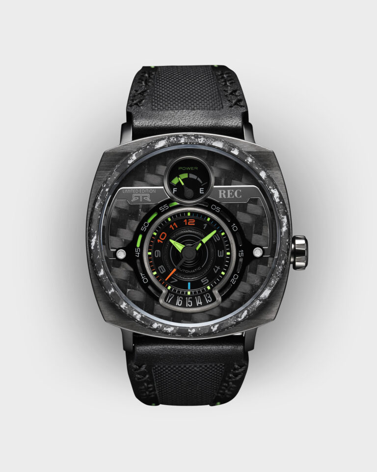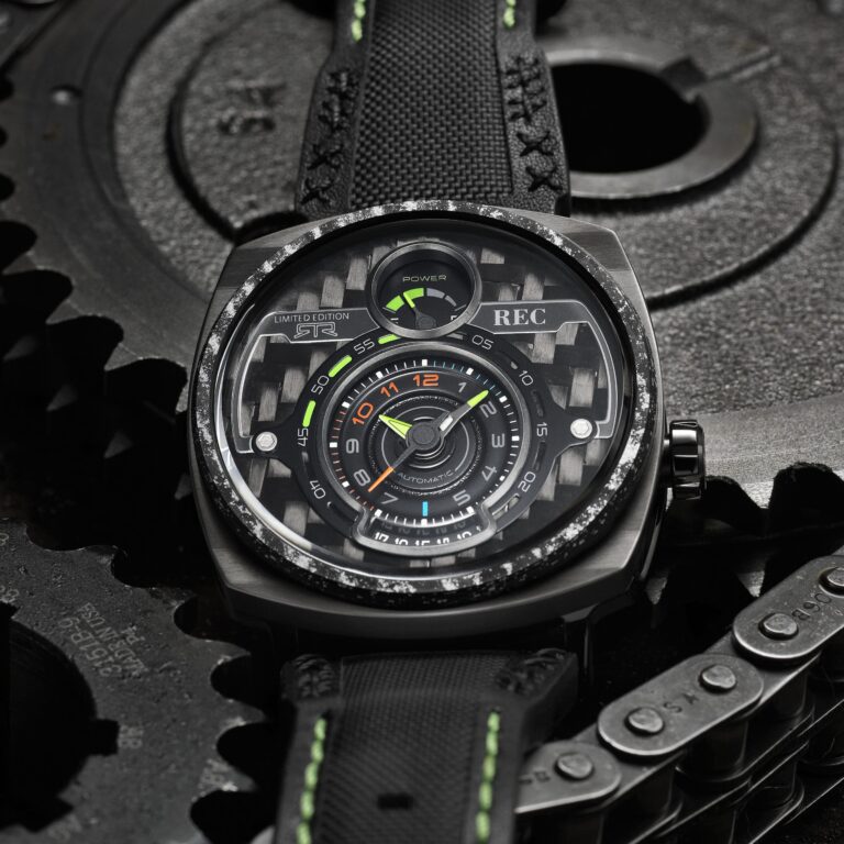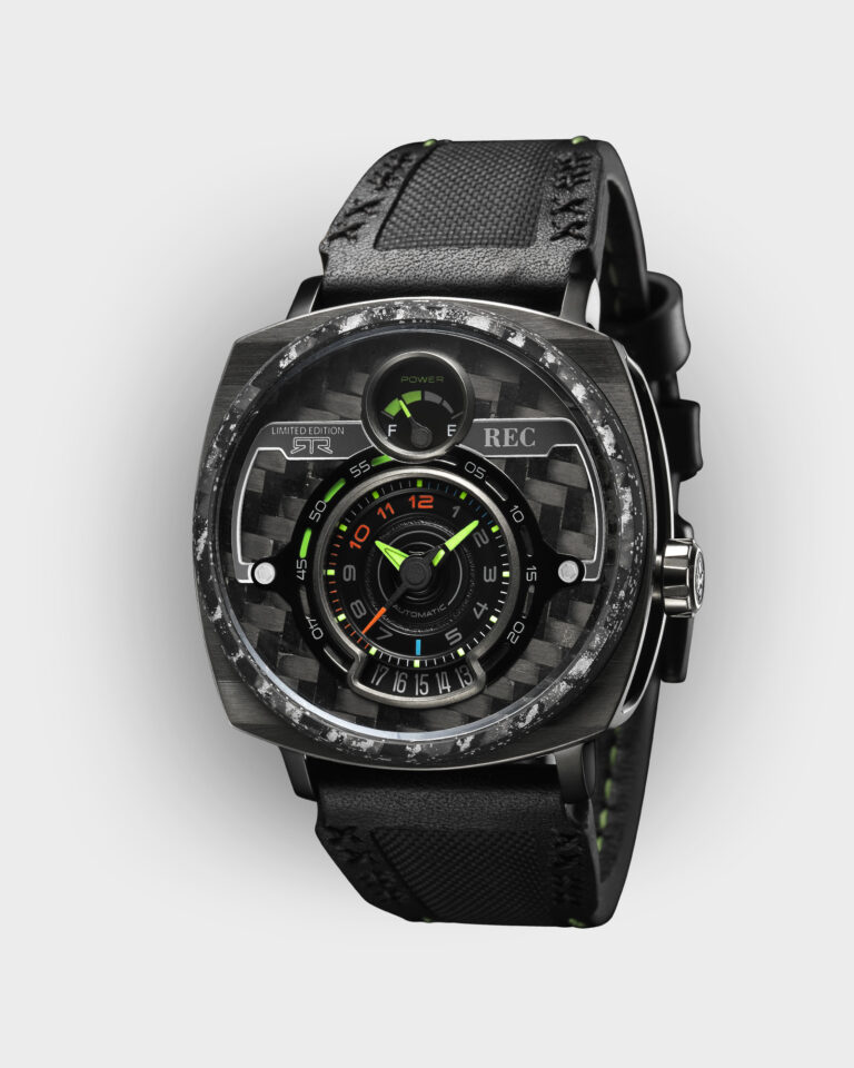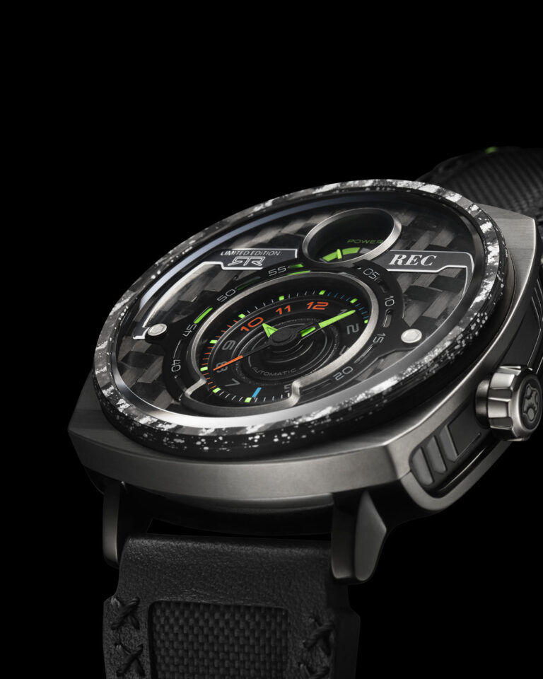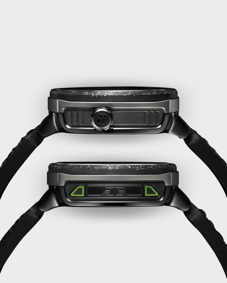 The P51 RTR encapsulates the essence of the Mustang RTR, integrating recycled carbon fiber and aluminum from the vehicle with RTR’s distinctive style. Its raw carbon dial, showcasing the wear from drifting, is complemented by a bezel made from recycled crushed carbon and aluminum sourced from the car’s suspension.