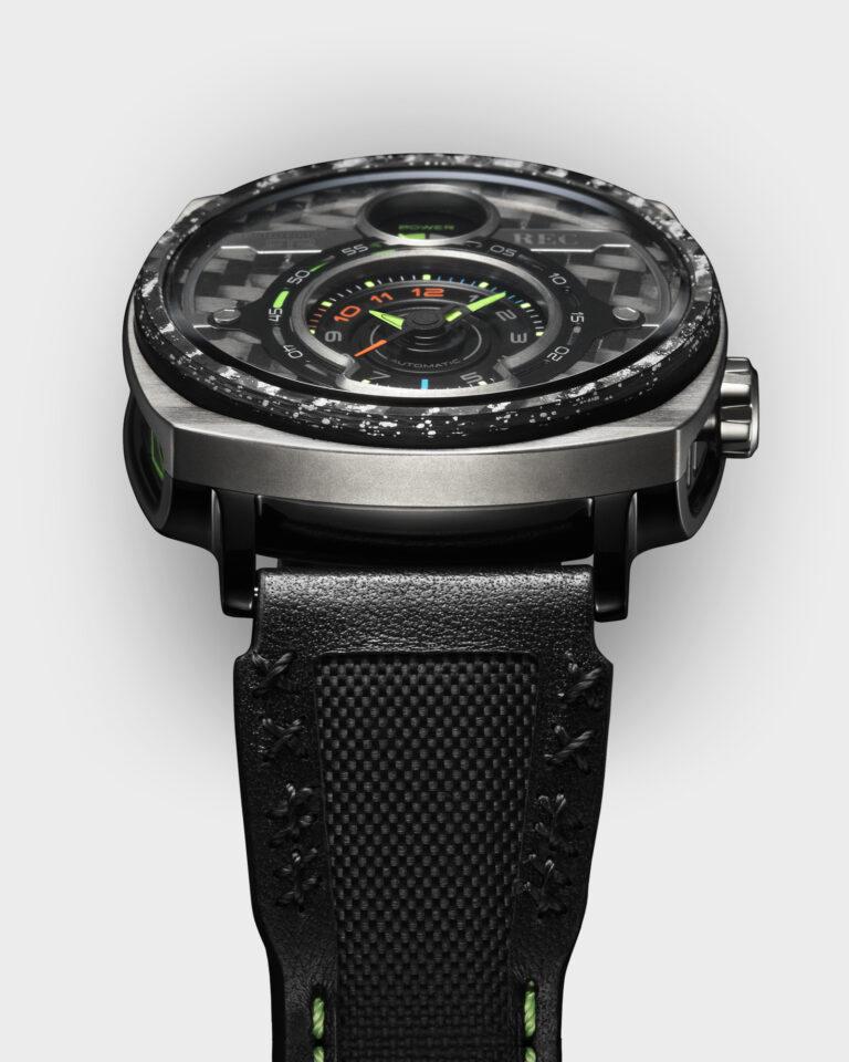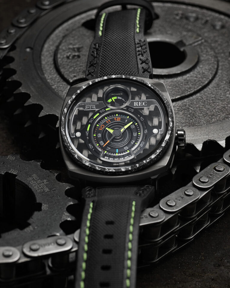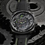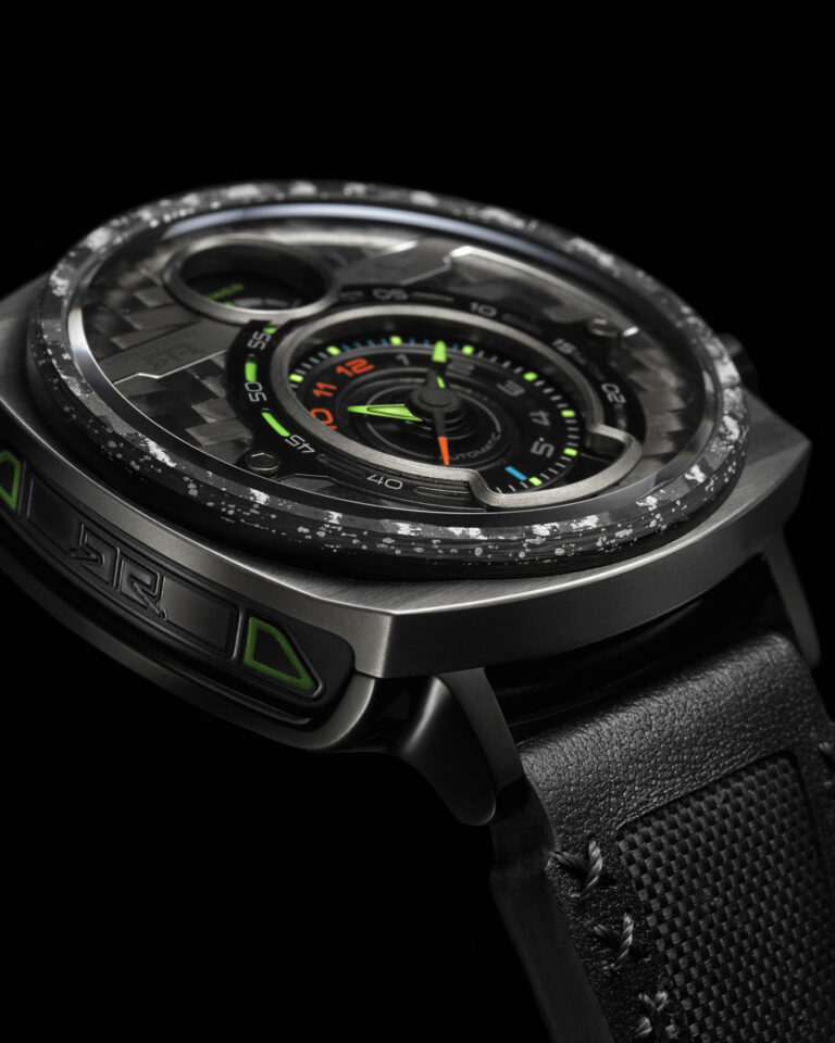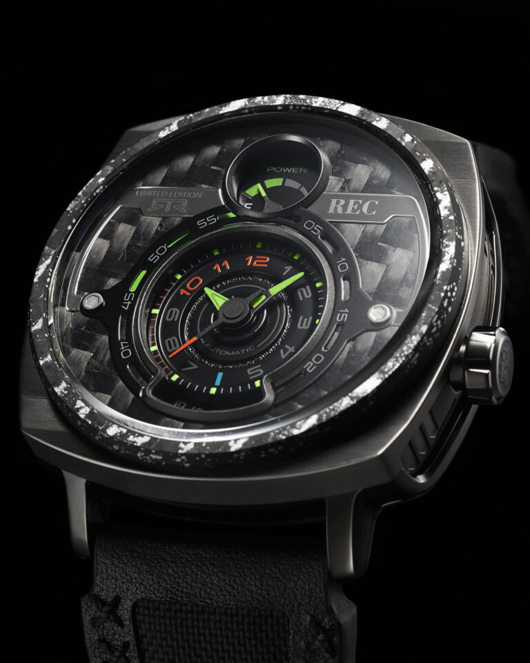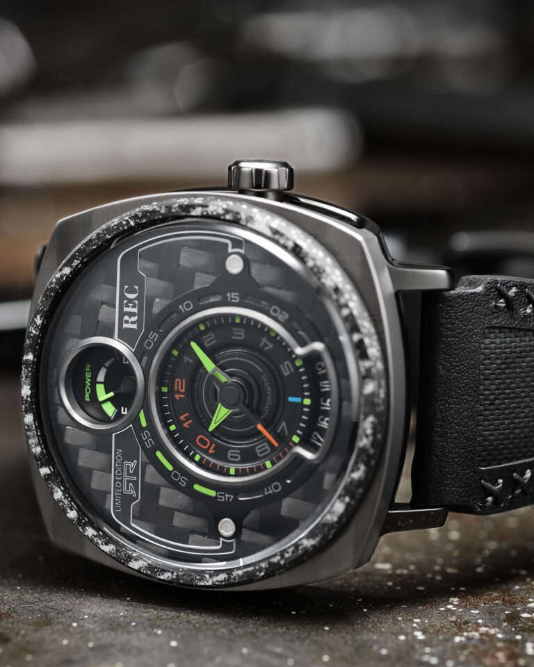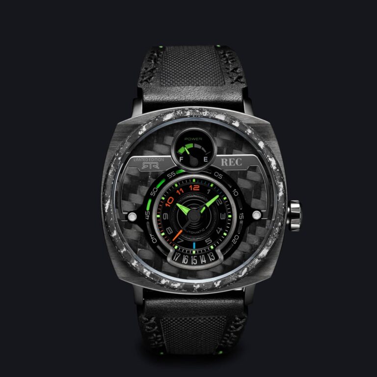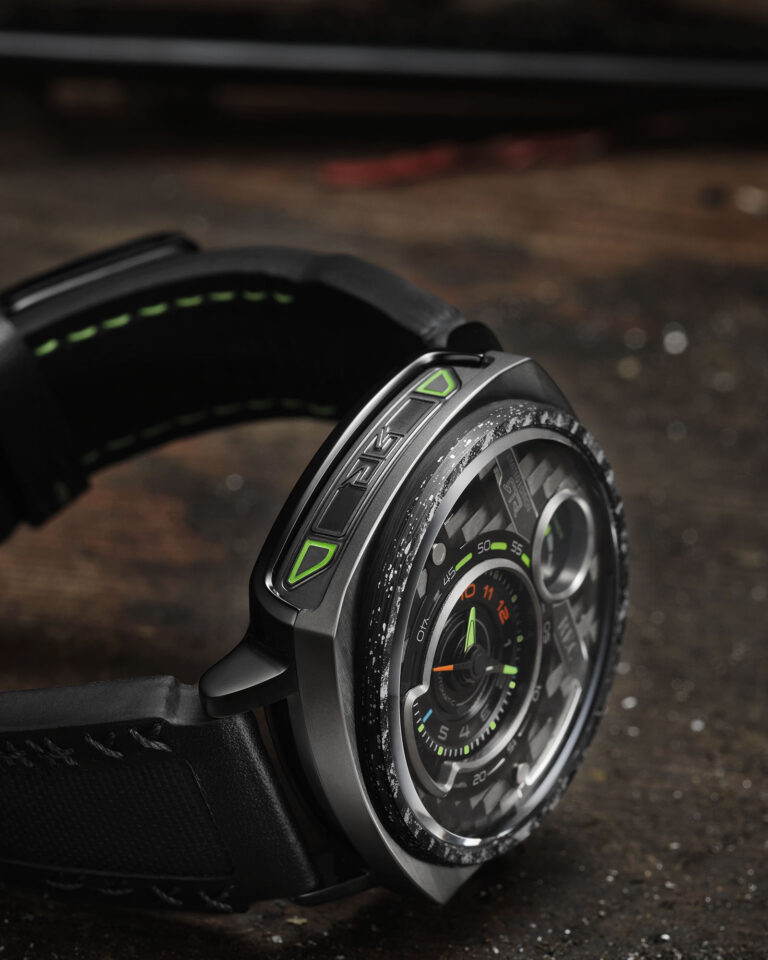 The P51 RTR encapsulates the essence of the Mustang RTR, integrating recycled carbon fiber and aluminum from the vehicle with RTR’s distinctive style. Its raw carbon dial, showcasing the wear from drifting, is complemented by a bezel made from recycled crushed carbon and aluminum sourced from the car’s suspension.